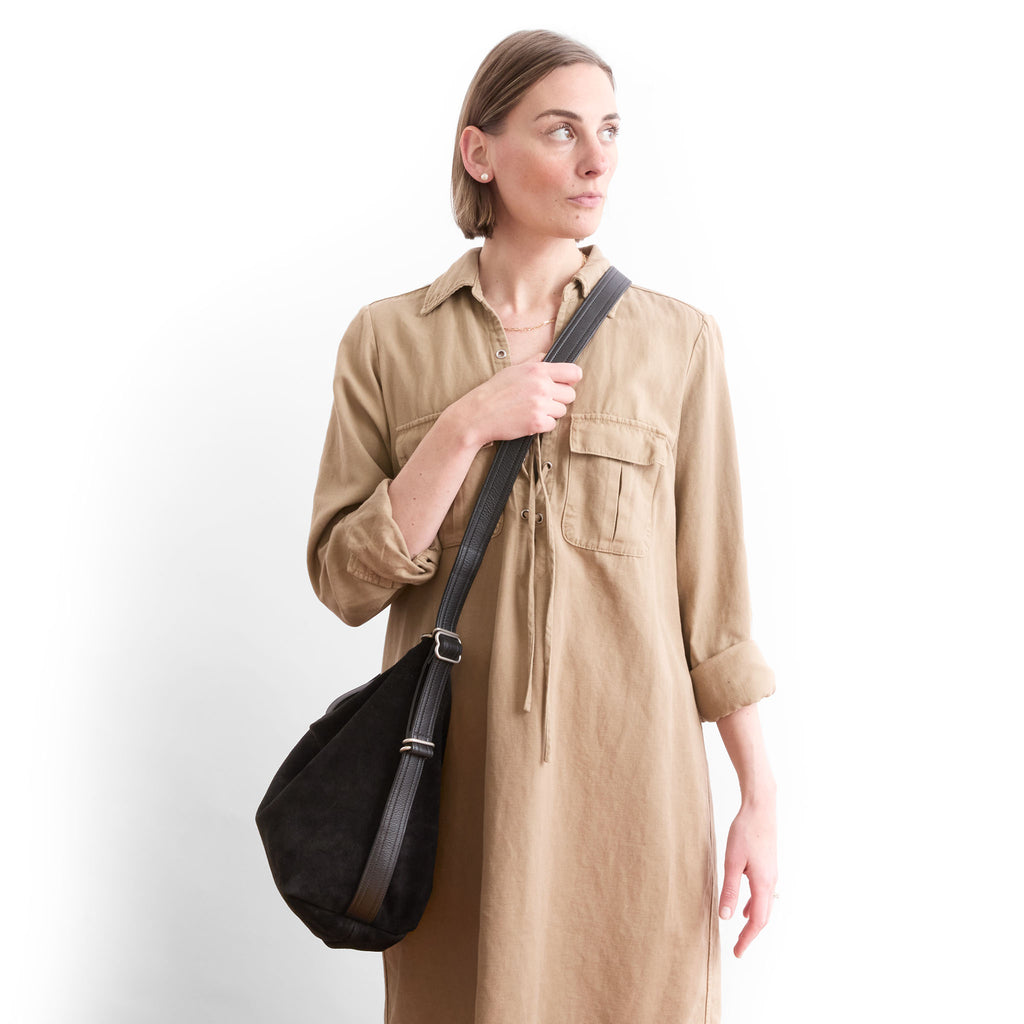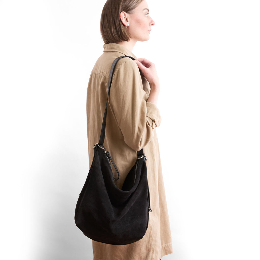 hobo pack original in nero black, low-profile strap adjusted as a backpack