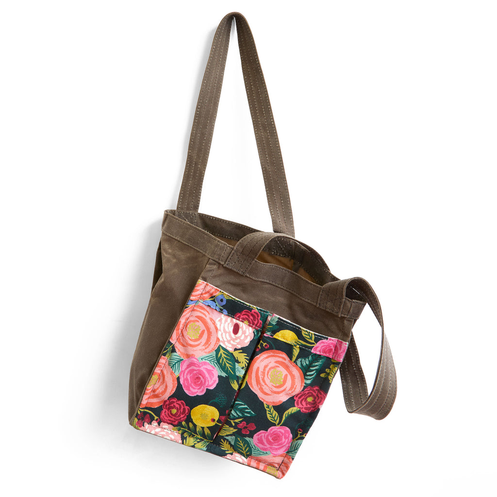 All waxed canvas tote with four deep outer pockets. This is such a sensible bag with two pockets inside as well.