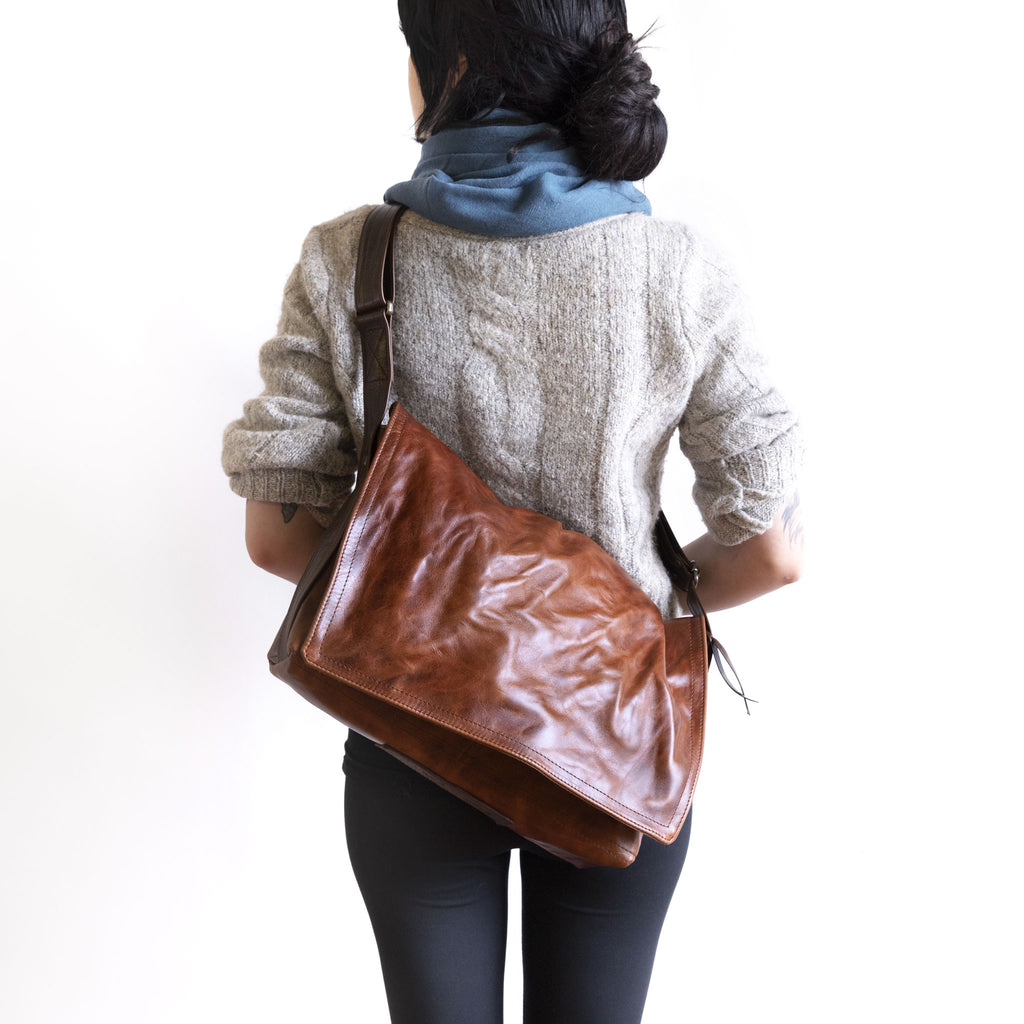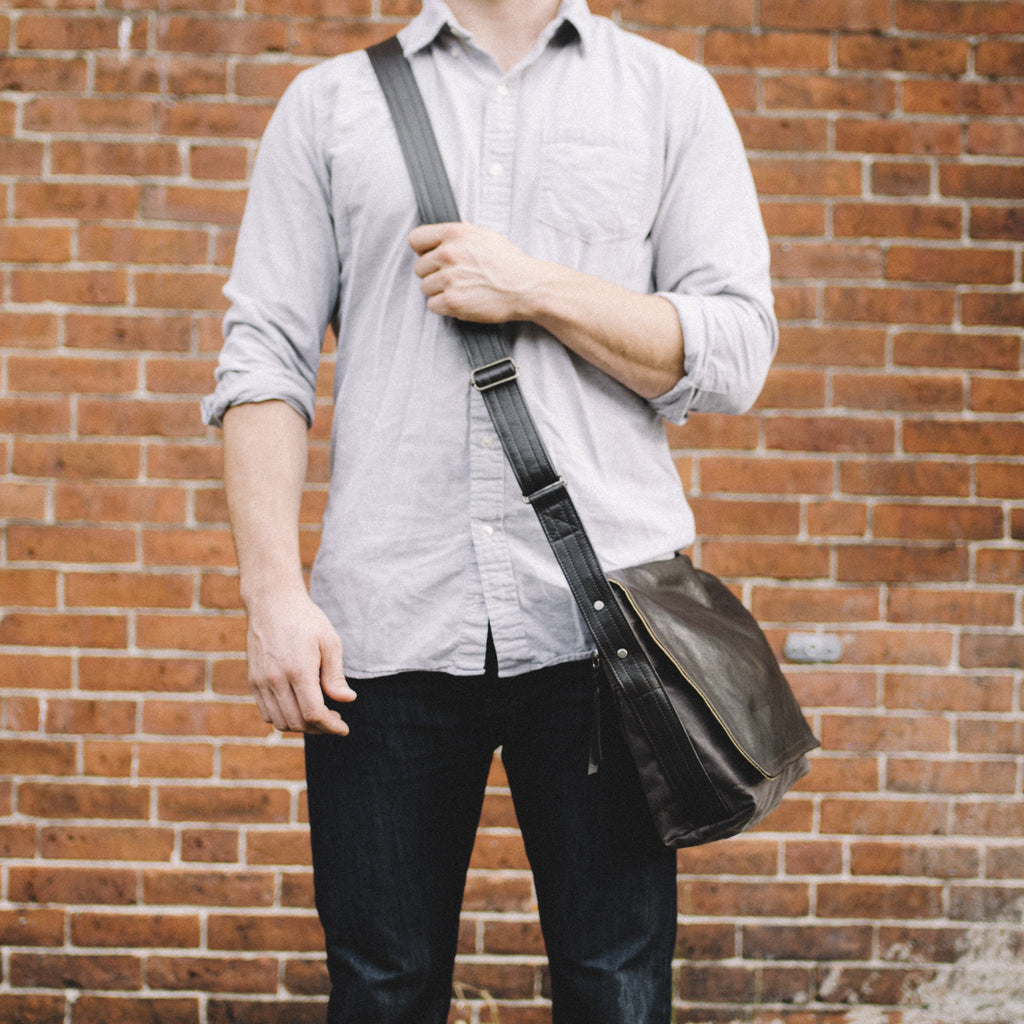 Many requests for a zippered top, lightweight laptop bag has led us here. Fit up to a 15" laptop. Back zippered pocket is essential for accessing ones phone when you bag is closed up. Wide comfy adjustable crossbody strap. Fully lined in waxed cotton canvas.