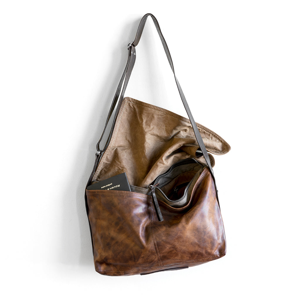 zip top messenger in fuentes, showcasing interior zippered pockets