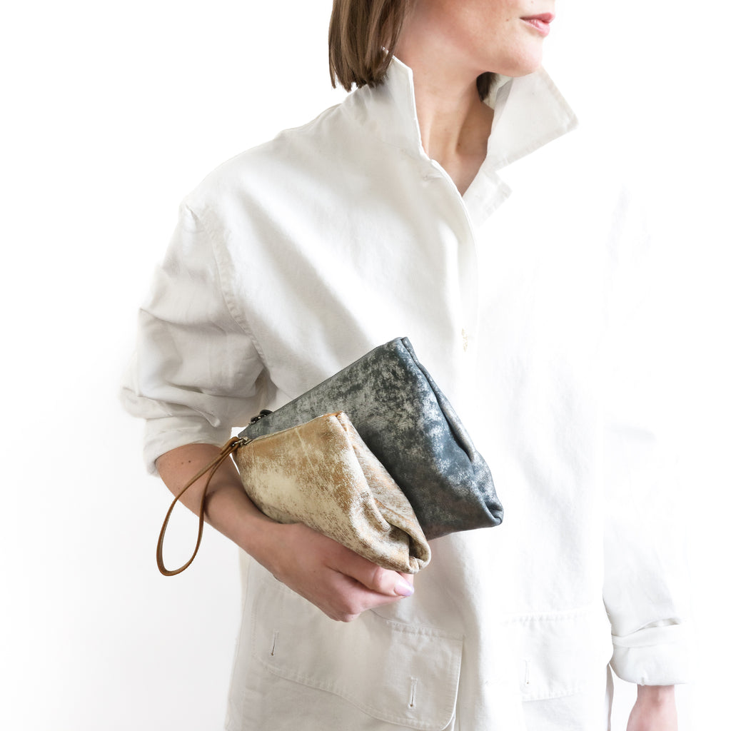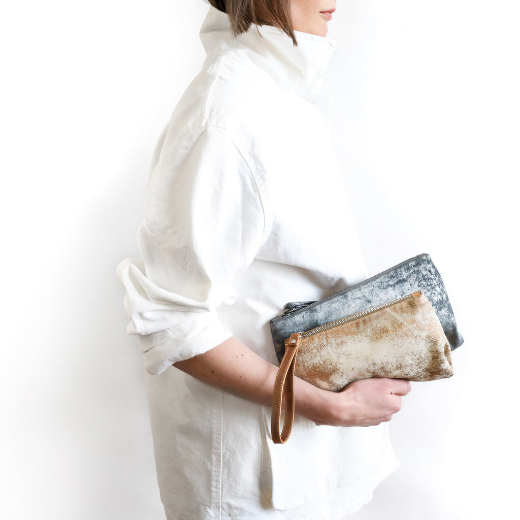 This soft hand pouch is a tactile experience. A subtle reinvention of the classic clutch takes a fresh look at a basic idea, and finds ways to add volume and soften edges. All to delight.