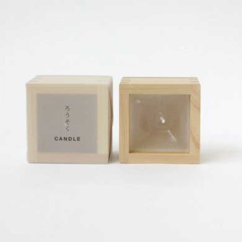 Hinoki Masu candle made with hinoki-scented wax. The container is a flameproof sake cup holder also made of hinoki wood. Designed to provide a gentle fragrance experience that complements the warmth and ambiance of the space.