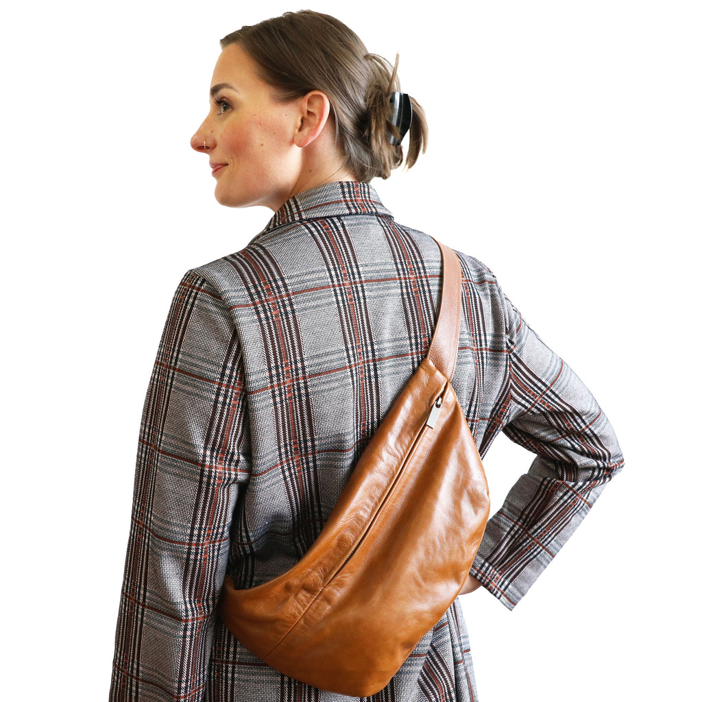 We all love a sling bag. The Gallery was designed to lay snug and flat on the body, front or back. Safe to maneuver in any gallery. Fits over or under a jacket. Fully lined in our signature Japanese textile, with two pockets