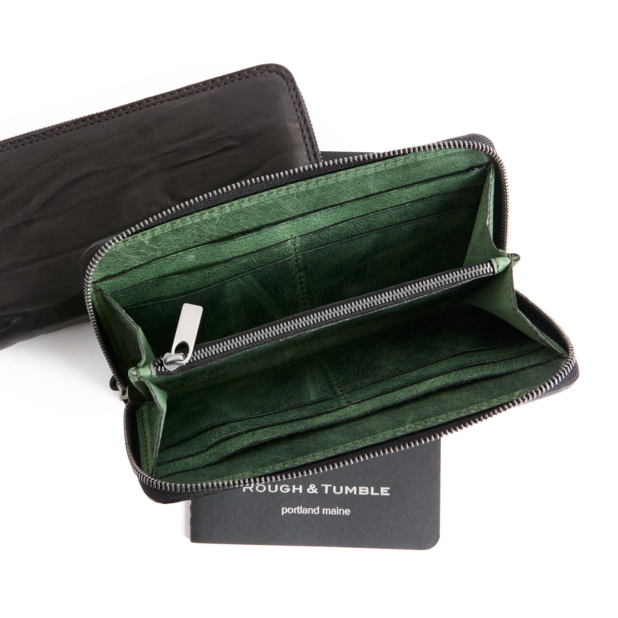 zip wallet in light saddle, showcasing both woven and metal pull options