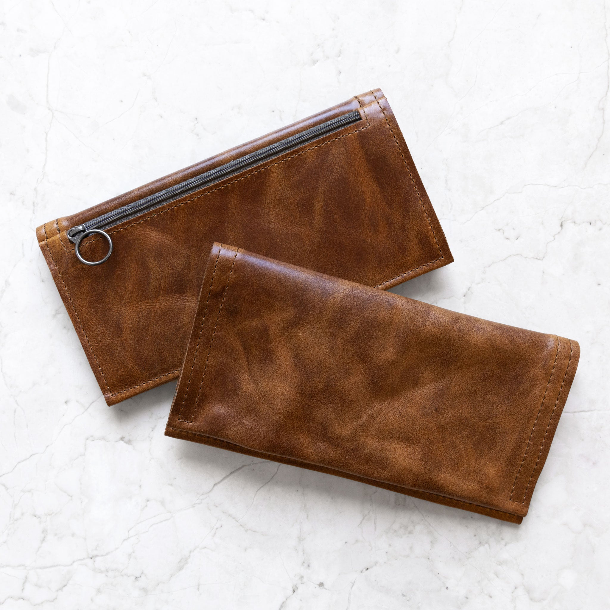snap wallet in premium saddle, showcasing back zippered pocket