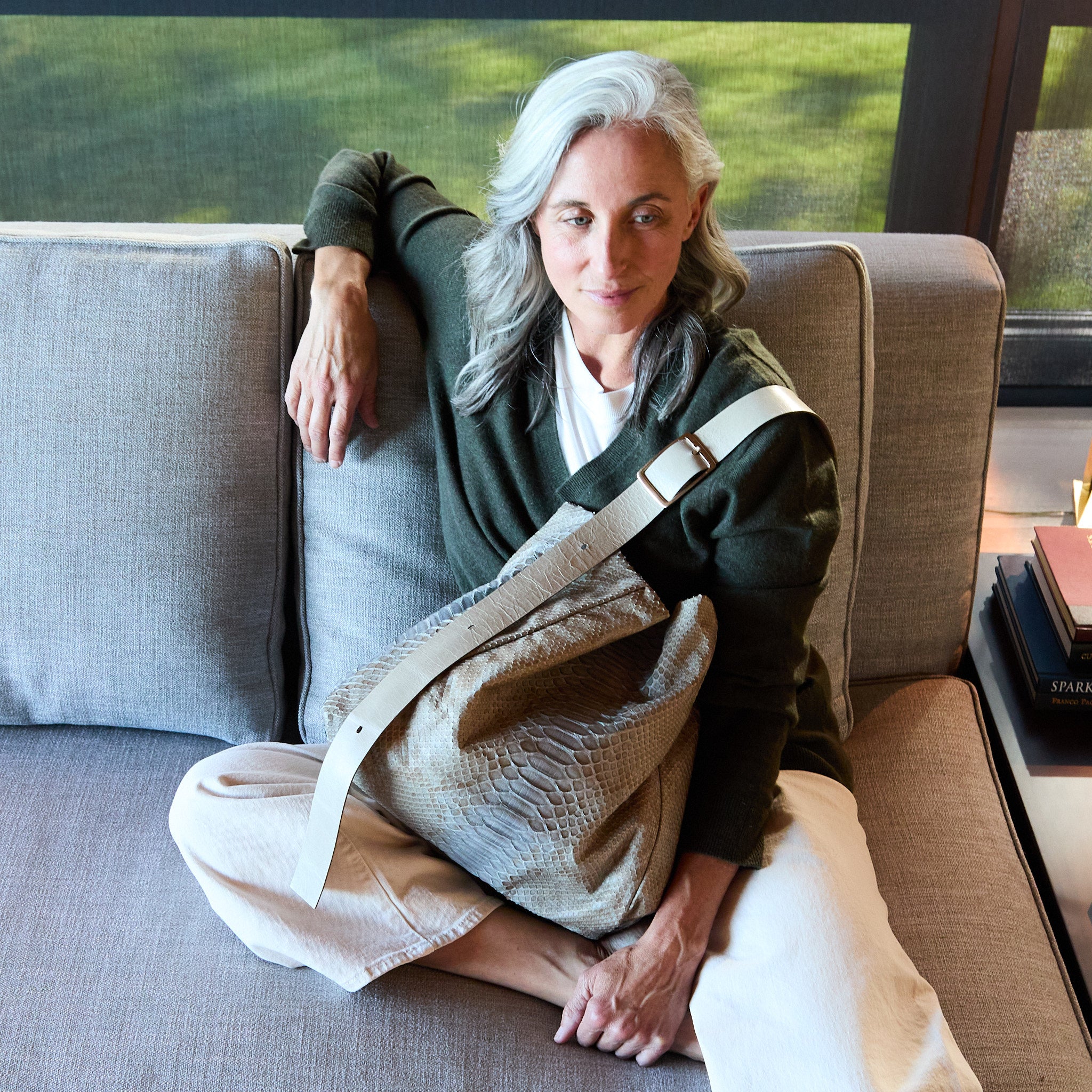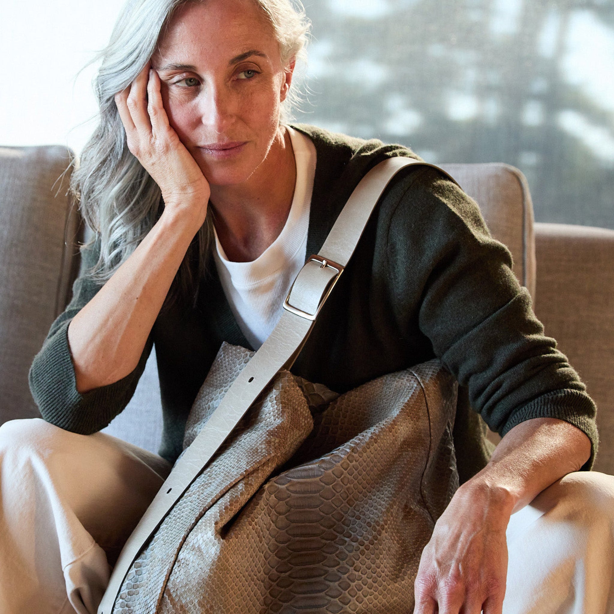 central boho in dusty blue and sesame python + sesame