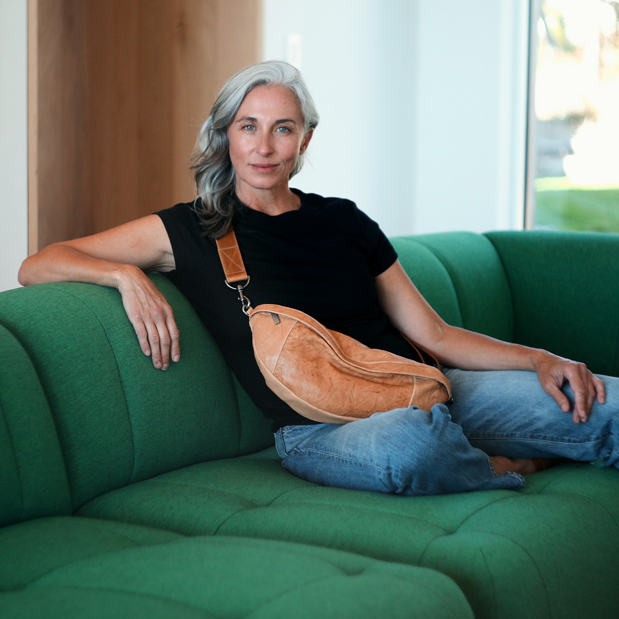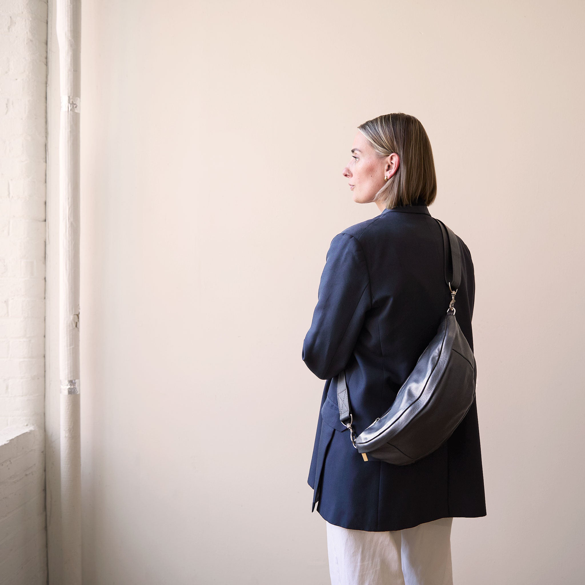 Sculptural, intuitive, lightweight. Our signature soft drape always feels comfy on the body. High end limited boutique leathers from around the world. Finished with R&T custom hardware and premium smooth close zippers. The roomy body and all three pockets are fully lined. Fits smartly into ones far away travels and the everyday errands. So many easy, hands free ways to wear this multi-pocket crossbody sling and shoulder bag.